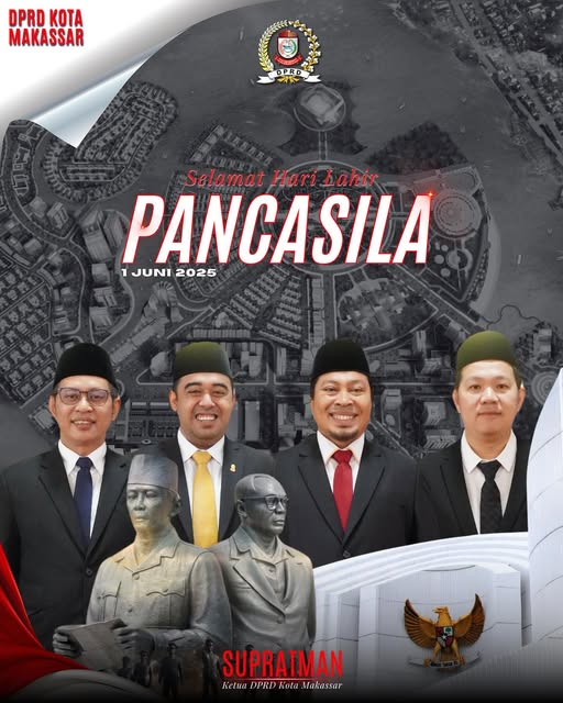“Selamat Hari Lahir Pancasila 1 Juni 2025. Pancasila adalah dasar pemersatu bangsa, landasan dalam berpikir, bersikap, dan bertindak menuju Indonesia yang adil dan makmur,” ucap Supratman, Ketua DPRD Kota Makassar.