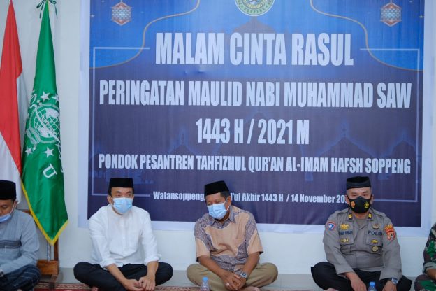 SaudagarNews,Soppeng—Menghadiri peringatan Maulid Nabi Muhammad SAW 1443 Hijriah tahun 2021 Masehi di Ponpes Tahfizhul Qur’an Al-Imam Hafsh. Bupati Soppeng HA Kaswadi Razak mengajak seluruh masyarakat Soppeng untuk bervaksin untuk menekan penyebaran virus covid-19.