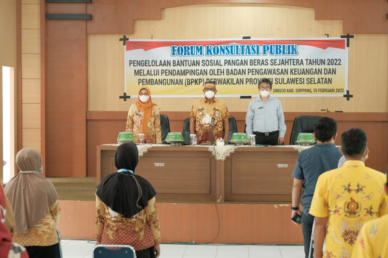 SaudagarNews,Soppeng—Dinas Sosial Kabupaten Soppeng menggelar forum konsultasi publik pengelolaan Bantuan Sosial (Bansos) Pangan Beras Sejahtera (Rastra) tahun 2022 melalui pendampingan oleh Badan Pengawasan Keuangan dan Pembangunan (BPKP) Provinsi Sulawesi Selatan, di Aula Kantor Dinas Pendidikan dan Kebudayaan Kabupaten Soppeng. kamis (10/02/2022).