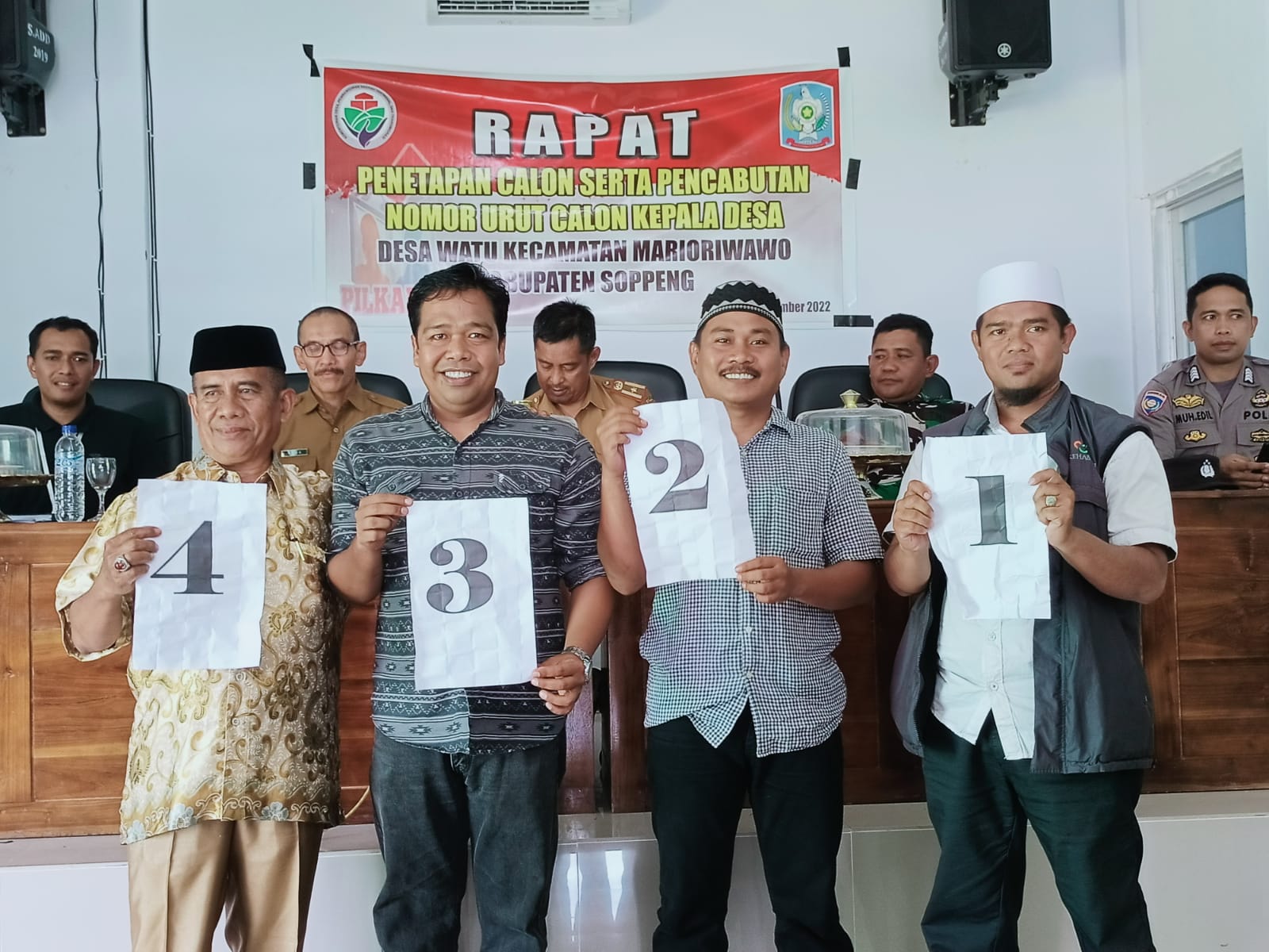 SaudagarNews,Soppeng—Panitia Pemilihan Kepala Desa (Pilkades) Watu melakukan penetapan dan pengundian nomor urut Calon Kepala Desa (Cakades) Desa Watu di Aula Kantor Desa Watu, selasa (8/11/2022).