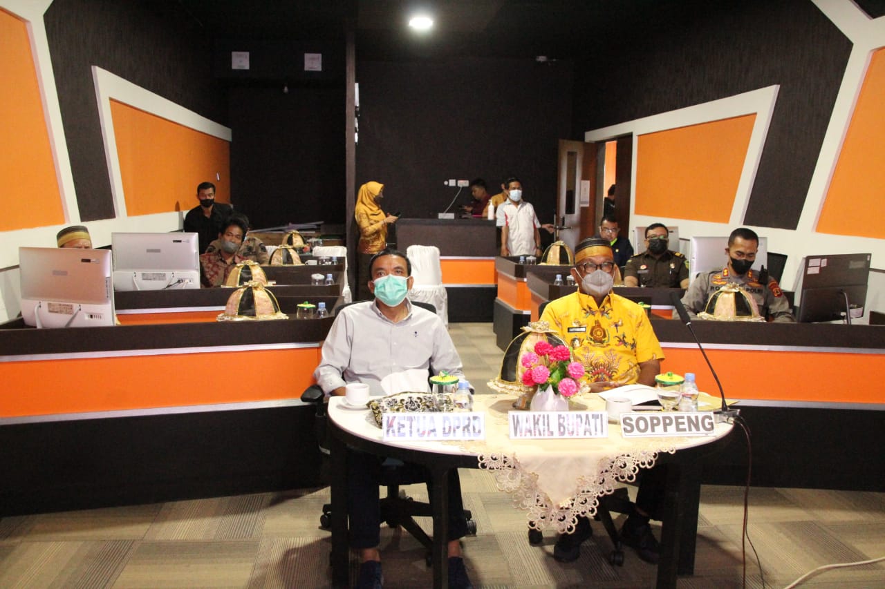 SaudagarNews,Soppeng—Wakil Bupati Soppeng Ir Lutfi Halide, MP bersama unsur Forkopimda mengikuti rapat koordinasi secara virtual tingkat provinsi Sulawesi Selatan dengan program percepatan vaksinasi 100 % yang dilangsungkan di ruang SCC kantor Bupati Soppeng. kamis (13/1/2022).