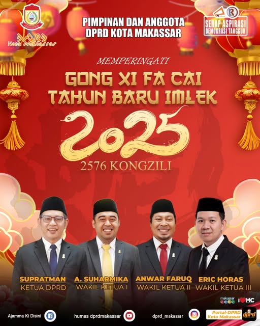 Saudagar.News, Makassar – Pimpinan dan Anggota Dewan Perwakilan Rakyat Daerah (DPRD) Kota Makassar mengucapkan selamat Tahun Baru Imlek 2025 kepada seluruh warga Kota Makassar yang merayakan.