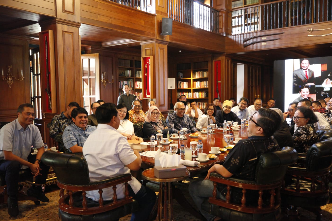 Diskusi yang berlangsung selama kurang lebih enam jam lamanya tersebut berjalan dengan santai bahkan seringkali dibalut dengan canda tawa riang gembira antara Prabowo dengan para Pemimpin Redaksi yang berbincang di ruang kerja sekaligus perpustakaan Prabowo di kediamannya.
