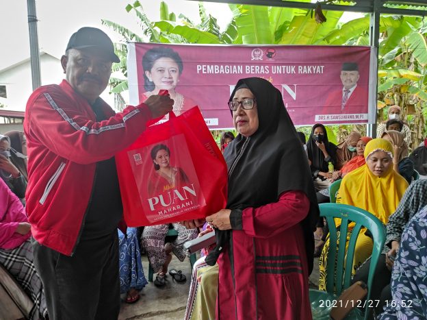 Dalam kegiatan ini Drs Samsu Niang menyerahkan langsung bantuan beras Puan Maharani kepada masyarakat sebanyak 200 paket lebih sembako.