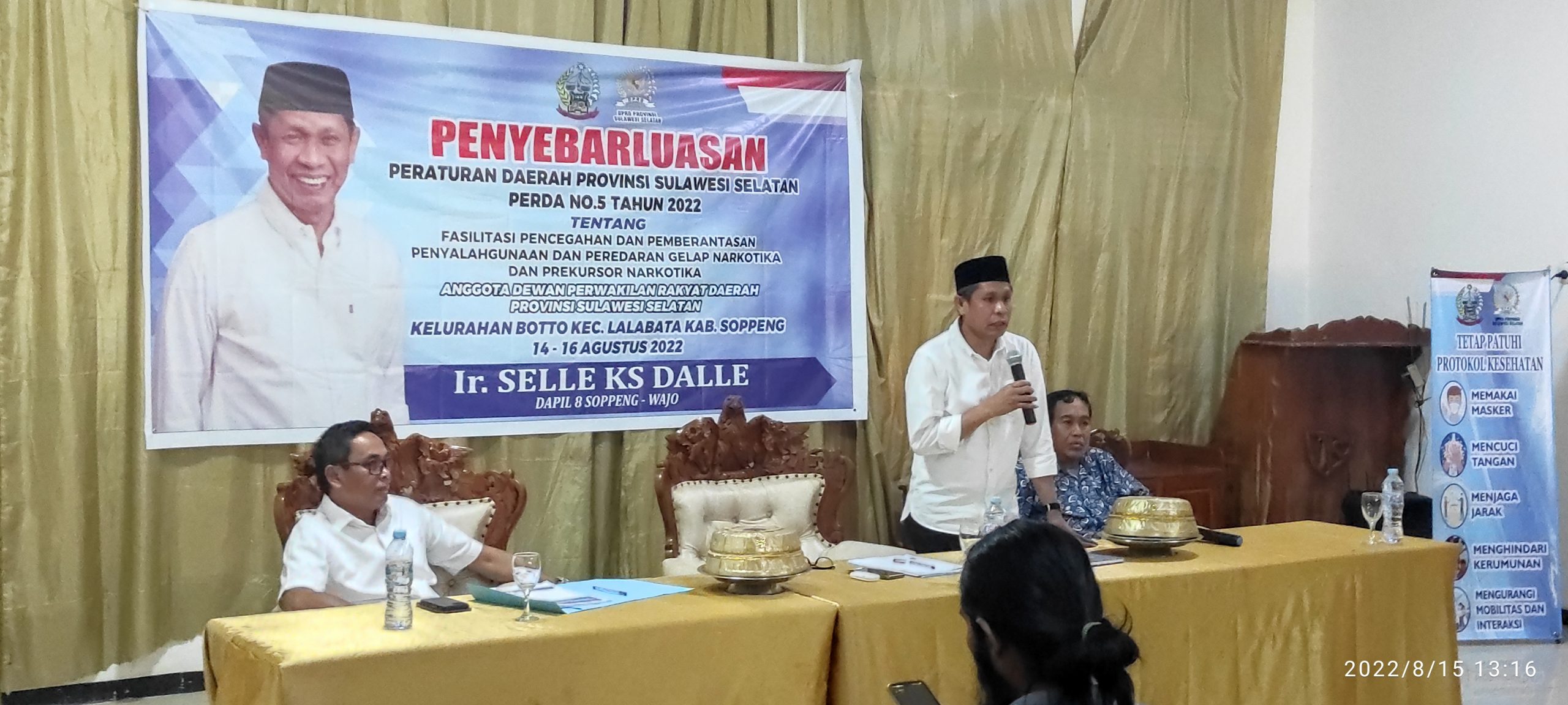 SaudagarNews,Soppeng—Anggota Dewan Perwakilan Rakyat Daerah (DPRD) Sulawesi Selatan, Ir. Selle KS Dalle menggelar sosialisasi penyebarluasan Peraturan Daerah Provinsi Sulawesi Selatan No. 5 Tahun 2022 tentang Fasilitas Pencegahan dan Pemberantasan Penyalahgunaan dan Peredaran Gelap Narkotika dan Prekursor Narkotika, di Hotel Kayangan Kelurahan Botto, Lalabata. senin (15/8/22).